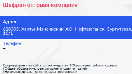 Шафран, оптовая компания по адресу 628305, Ханты-Мансийский АО, Нефтеюганск, Сургутская, 16/1 в дальнейшем Организация, размещена в следующих категориях: