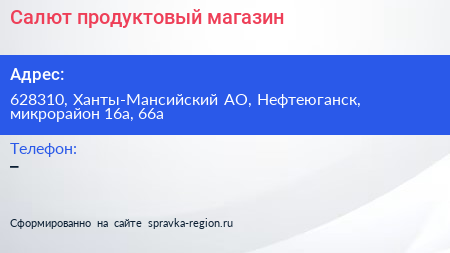 Салют, продуктовый магазин по адресу 628310, Ханты-Мансийский АО, Нефтеюганск, микрорайон 16а, 66а в дальнейшем Организация, размещена в следующих категориях: