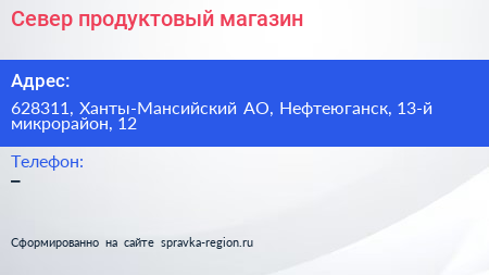 Север, продуктовый магазин по адресу 628311, Ханты-Мансийский АО, Нефтеюганск, 13-й микрорайон, 12 в дальнейшем Организация, размещена в следующих категориях: