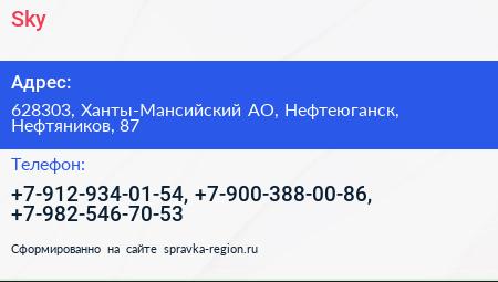 Sky по адресу 628303, Ханты-Мансийский АО, Нефтеюганск, Нефтяников, 87 в дальнейшем Организация, размещена в следующих категориях: