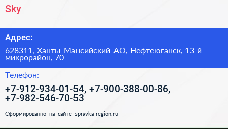 Sky по адресу 628311, Ханты-Мансийский АО, Нефтеюганск, 13-й микрорайон, 70 в дальнейшем Организация, размещена в следующих категориях: