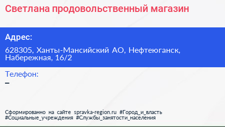 Светлана, продовольственный магазин по адресу 628305, Ханты-Мансийский АО, Нефтеюганск, Набережная, 16/2 в дальнейшем Организация, размещена в следующих категориях: