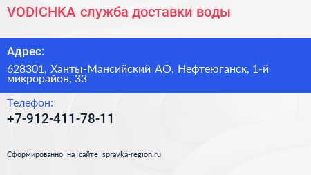 VODICHKA, служба доставки воды по адресу 628301, Ханты-Мансийский АО, Нефтеюганск, 1-й микрорайон, 33 в дальнейшем Организация, размещена в следующих категориях: