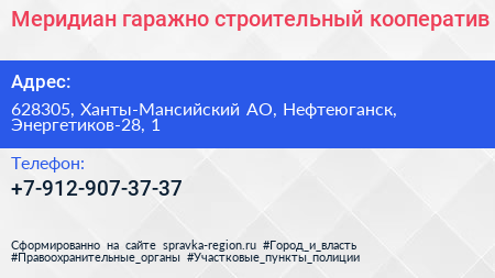 Меридиан, гаражно-строительный кооператив по адресу 628305, Ханты-Мансийский АО, Нефтеюганск, Энергетиков-28, 1 в дальнейшем Организация, размещена в следующих категориях:
