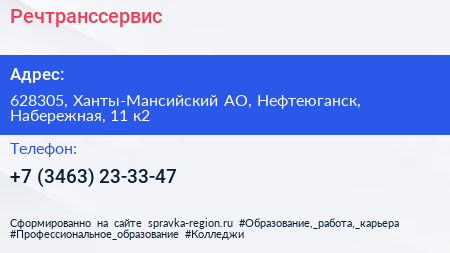 Речтранссервис по адресу 628305, Ханты-Мансийский АО, Нефтеюганск, Набережная, 11 к2 в дальнейшем Организация, размещена в следующих категориях: