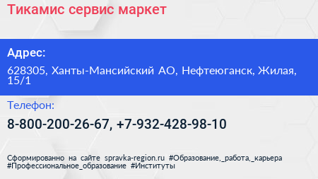 Тикамис, сервис-маркет по адресу 628305, Ханты-Мансийский АО, Нефтеюганск, Жилая, 15/1 в дальнейшем Организация, размещена в следующих категориях: