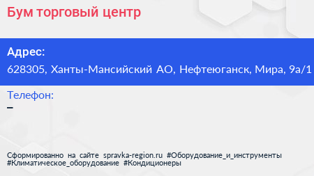 Бум, торговый центр по адресу 628305, Ханты-Мансийский АО, Нефтеюганск, Мира, 9а/1 в дальнейшем Организация, размещена в следующих категориях: