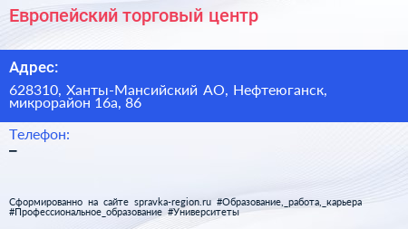 Европейский, торговый центр по адресу 628310, Ханты-Мансийский АО, Нефтеюганск, микрорайон 16а, 86 в дальнейшем Организация, размещена в следующих категориях: