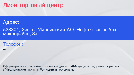 Лион, торговый центр по адресу 628301, Ханты-Мансийский АО, Нефтеюганск, 5-й микрорайон, 3а в дальнейшем Организация, размещена в следующих категориях: