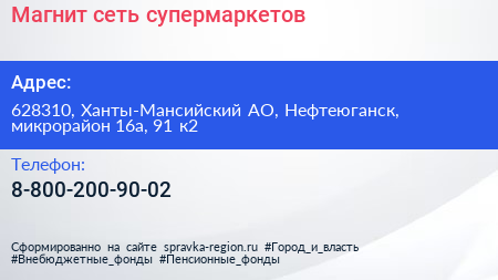 Магнит, сеть супермаркетов по адресу 628310, Ханты-Мансийский АО, Нефтеюганск, микрорайон 16а, 91 к2 в дальнейшем Организация, размещена в следующих категориях:
