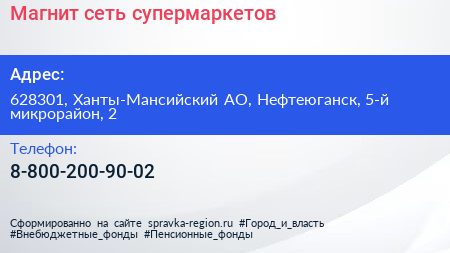 Магнит, сеть супермаркетов по адресу 628301, Ханты-Мансийский АО, Нефтеюганск, 5-й микрорайон, 2 в дальнейшем Организация, размещена в следующих категориях:
