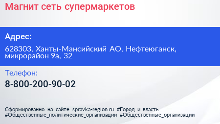 Магнит, сеть супермаркетов по адресу 628303, Ханты-Мансийский АО, Нефтеюганск, микрорайон 9а, 32 в дальнейшем Организация, размещена в следующих категориях: