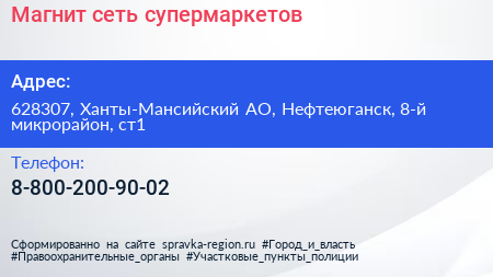 Магнит, сеть супермаркетов по адресу 628307, Ханты-Мансийский АО, Нефтеюганск, 8-й микрорайон, ст1 в дальнейшем Организация, размещена в следующих категориях:
