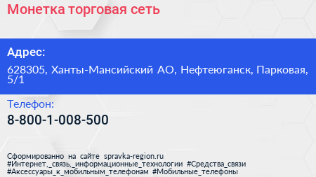 Монетка, торговая сеть по адресу 628305, Ханты-Мансийский АО, Нефтеюганск, Парковая, 5/1 в дальнейшем Организация, размещена в следующих категориях: