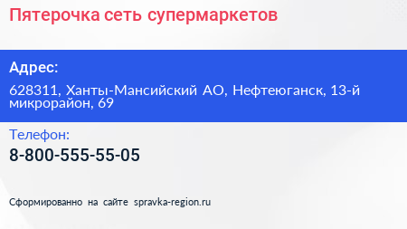 Пятерочка, сеть супермаркетов по адресу 628311, Ханты-Мансийский АО, Нефтеюганск, 13-й микрорайон, 69 в дальнейшем Организация, размещена в следующих категориях: