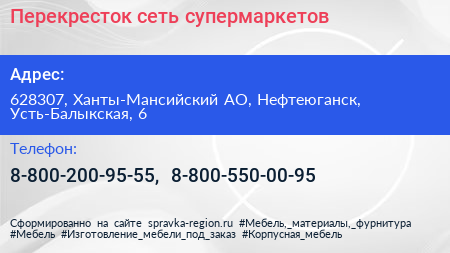 Перекресток, сеть супермаркетов по адресу 628307, Ханты-Мансийский АО, Нефтеюганск, Усть-Балыкская, 6 в дальнейшем Организация, размещена в следующих категориях: