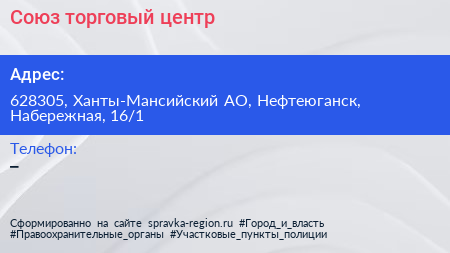 Союз, торговый центр по адресу 628305, Ханты-Мансийский АО, Нефтеюганск, Набережная, 16/1 в дальнейшем Организация, размещена в следующих категориях: