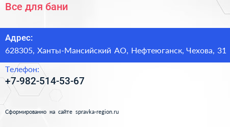 Все для бани по адресу 628305, Ханты-Мансийский АО, Нефтеюганск, Чехова, 31 в дальнейшем Организация, размещена в следующих категориях: