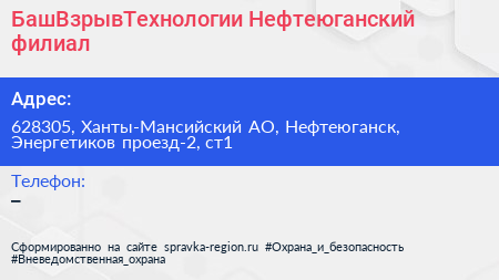 БашВзрывТехнологии, Нефтеюганский филиал по адресу 628305, Ханты-Мансийский АО, Нефтеюганск, Энергетиков проезд-2, ст1 в дальнейшем Организация, размещена в следующих категориях:
