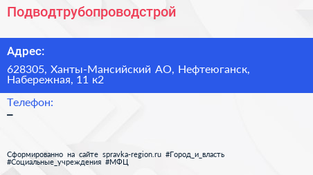 Подводтрубопроводстрой по адресу 628305, Ханты-Мансийский АО, Нефтеюганск, Набережная, 11 к2 в дальнейшем Организация, размещена в следующих категориях: