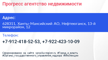 Прогресс, агентство недвижимости по адресу 628311, Ханты-Мансийский АО, Нефтеюганск, 13-й микрорайон, 12 в дальнейшем Организация, размещена в следующих категориях: