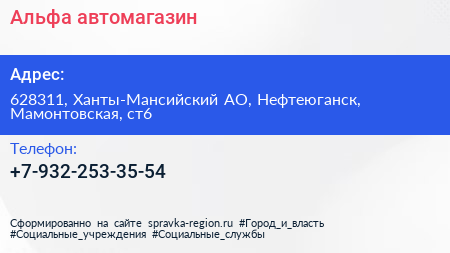 Альфа, автомагазин по адресу 628311, Ханты-Мансийский АО, Нефтеюганск, Мамонтовская, ст6 в дальнейшем Организация, размещена в следующих категориях: