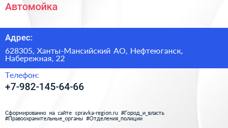 Автомойка по адресу 628305, Ханты-Мансийский АО, Нефтеюганск, Набережная, 22 в дальнейшем Организация, размещена в следующих категориях: