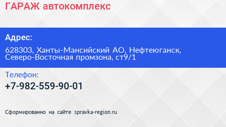 ГАРАЖ, автокомплекс по адресу 628303, Ханты-Мансийский АО, Нефтеюганск, Северо-Восточная промзона, ст9/1 в дальнейшем Организация, размещена в следующих категориях: