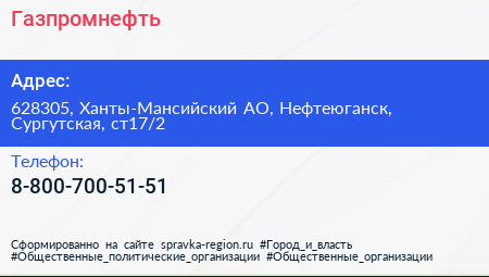 Газпромнефть по адресу 628305, Ханты-Мансийский АО, Нефтеюганск, Сургутская, ст17/2 в дальнейшем Организация, размещена в следующих категориях: