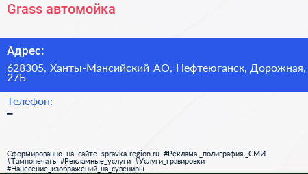Grass, автомойка по адресу 628305, Ханты-Мансийский АО, Нефтеюганск, Дорожная, 27Б в дальнейшем Организация, размещена в следующих категориях: