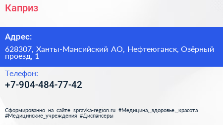 Каприз по адресу 628307, Ханты-Мансийский АО, Нефтеюганск, Озёрный проезд, 1 в дальнейшем Организация, размещена в следующих категориях: