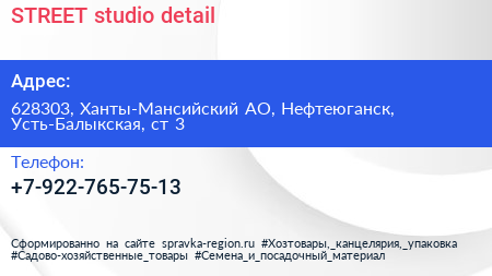 STREET studio detail по адресу 628303, Ханты-Мансийский АО, Нефтеюганск, Усть-Балыкская, ст 3 в дальнейшем Организация, размещена в следующих категориях: