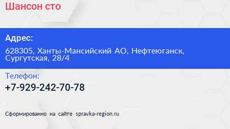 Шансон, сто по адресу 628305, Ханты-Мансийский АО, Нефтеюганск, Сургутская, 28/4 в дальнейшем Организация, размещена в следующих категориях: