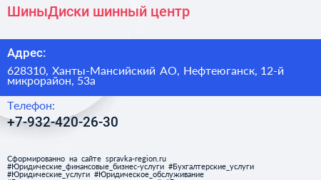 ШиныДиски, шинный центр по адресу 628310, Ханты-Мансийский АО, Нефтеюганск, 12-й микрорайон, 53а в дальнейшем Организация, размещена в следующих категориях: