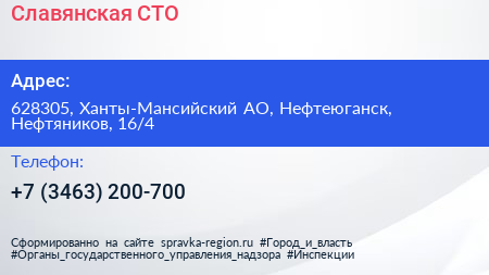 Славянская, СТО по адресу 628305, Ханты-Мансийский АО, Нефтеюганск, Нефтяников, 16/4 в дальнейшем Организация, размещена в следующих категориях: