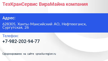 ТехКранСервис-ВираМайна, компания по адресу 628305, Ханты-Мансийский АО, Нефтеюганск, Сургутская, 26 в дальнейшем Организация, размещена в следующих категориях: