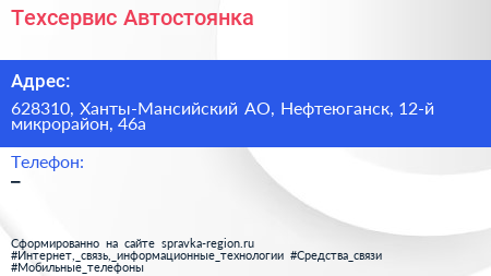 Техсервис, Автостоянка по адресу 628310, Ханты-Мансийский АО, Нефтеюганск, 12-й микрорайон, 46а в дальнейшем Организация, размещена в следующих категориях: