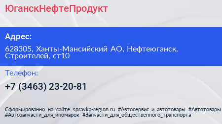 ЮганскНефтеПродукт по адресу 628305, Ханты-Мансийский АО, Нефтеюганск, Строителей, ст10 в дальнейшем Организация, размещена в следующих категориях:
