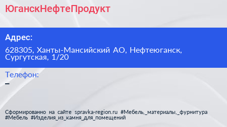 ЮганскНефтеПродукт по адресу 628305, Ханты-Мансийский АО, Нефтеюганск, Сургутская, 1/20 в дальнейшем Организация, размещена в следующих категориях: