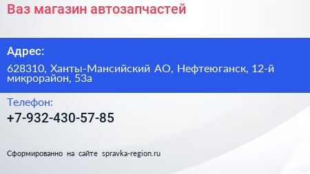 Ваз, магазин автозапчастей по адресу 628310, Ханты-Мансийский АО, Нефтеюганск, 12-й микрорайон, 53а в дальнейшем Организация, размещена в следующих категориях: