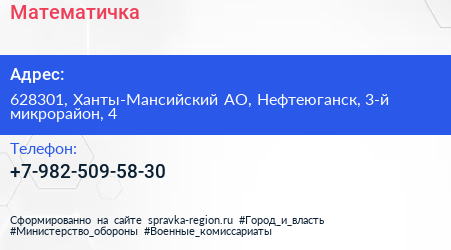 Математичка по адресу 628301, Ханты-Мансийский АО, Нефтеюганск, 3-й микрорайон, 4 в дальнейшем Организация, размещена в следующих категориях:
