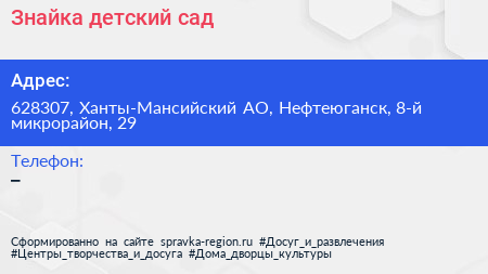 Знайка, детский сад по адресу 628307, Ханты-Мансийский АО, Нефтеюганск, 8-й микрорайон, 29 в дальнейшем Организация, размещена в следующих категориях: