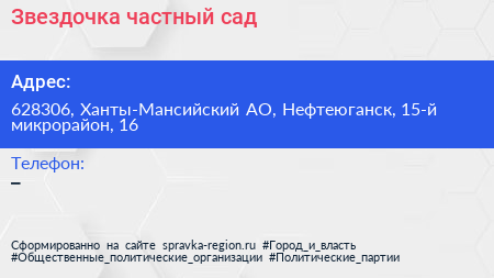 Звездочка, частный сад по адресу 628306, Ханты-Мансийский АО, Нефтеюганск, 15-й микрорайон, 16 в дальнейшем Организация, размещена в следующих категориях: