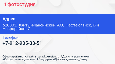+1, фотостудия по адресу 628303, Ханты-Мансийский АО, Нефтеюганск, 6-й микрорайон, 7 в дальнейшем Организация, размещена в следующих категориях: