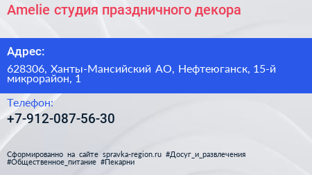 Amelie, студия праздничного декора по адресу 628306, Ханты-Мансийский АО, Нефтеюганск, 15-й микрорайон, 1 в дальнейшем Организация, размещена в следующих категориях: