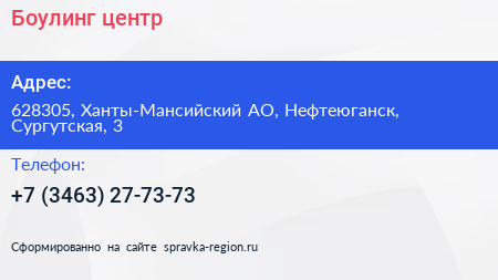 Боулинг центр по адресу 628305, Ханты-Мансийский АО, Нефтеюганск, Сургутская, 3 в дальнейшем Организация, размещена в следующих категориях: