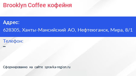 Brooklyn Coffee, кофейня по адресу 628305, Ханты-Мансийский АО, Нефтеюганск, Мира, 8/1 в дальнейшем Организация, размещена в следующих категориях: