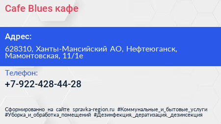 Cafe Blues, кафе по адресу 628310, Ханты-Мансийский АО, Нефтеюганск, Мамонтовская, 11/1е в дальнейшем Организация, размещена в следующих категориях: