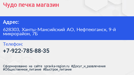 Чудо-печка, магазин по адресу 628303, Ханты-Мансийский АО, Нефтеюганск, 9-й микрорайон, 7Б в дальнейшем Организация, размещена в следующих категориях: