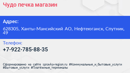 Чудо-печка, магазин по адресу 628305, Ханты-Мансийский АО, Нефтеюганск, Спутник, 49 в дальнейшем Организация, размещена в следующих категориях:
